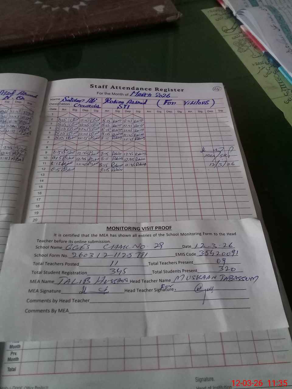 | Attendance Register | Head Teacher | MEA with School | Visit Proof |