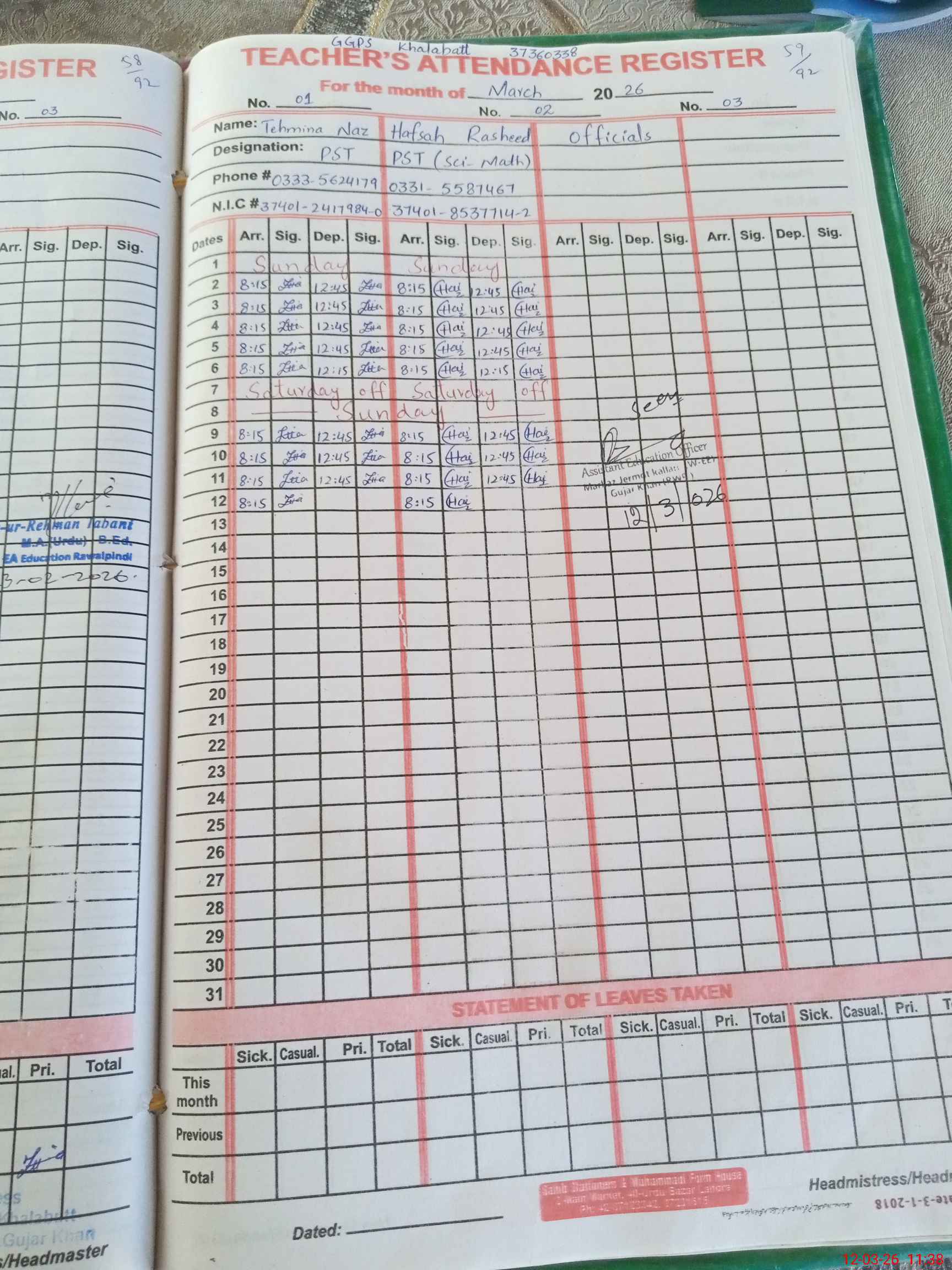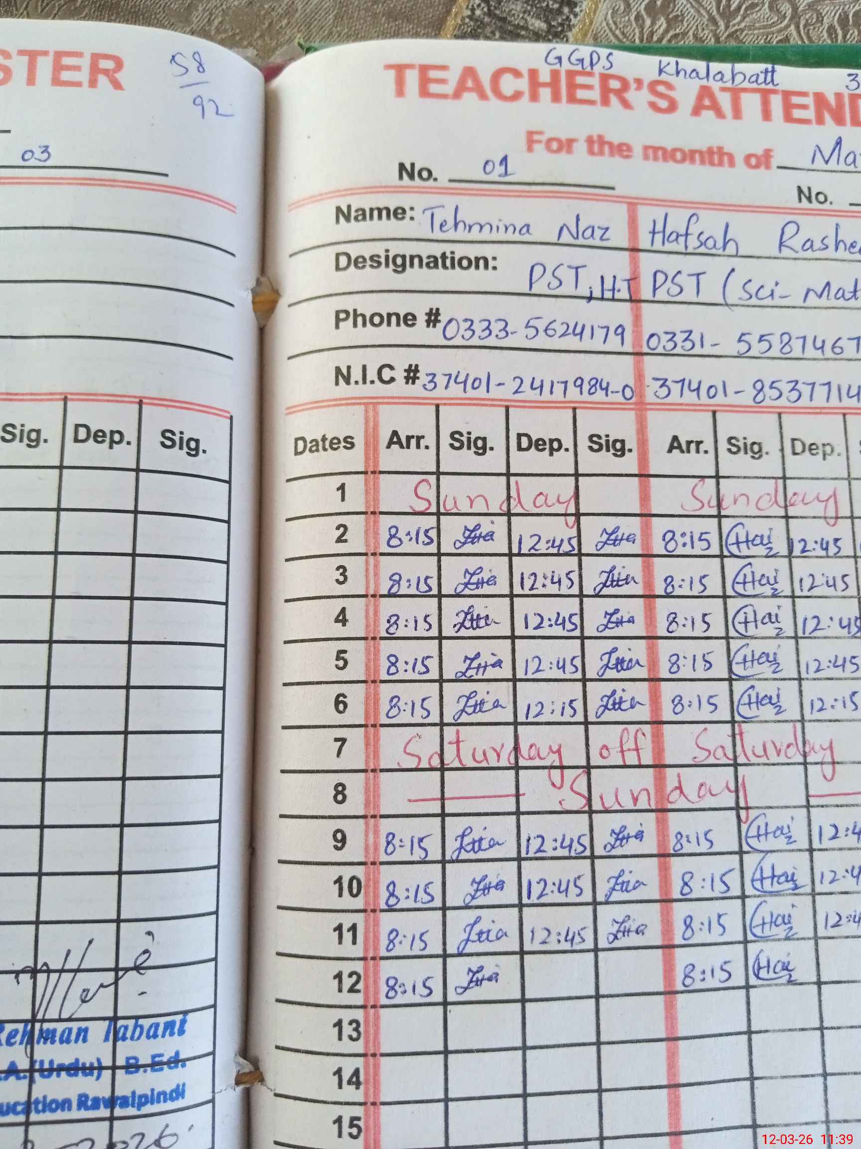 | CNIC | Full Name | Designation | R/C | Absence During Last Calender Month |