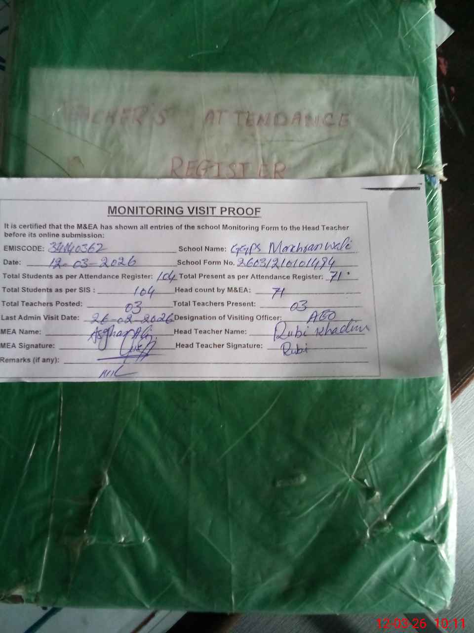 | Attendance Register | Head Teacher | MEA with School | Visit Proof |