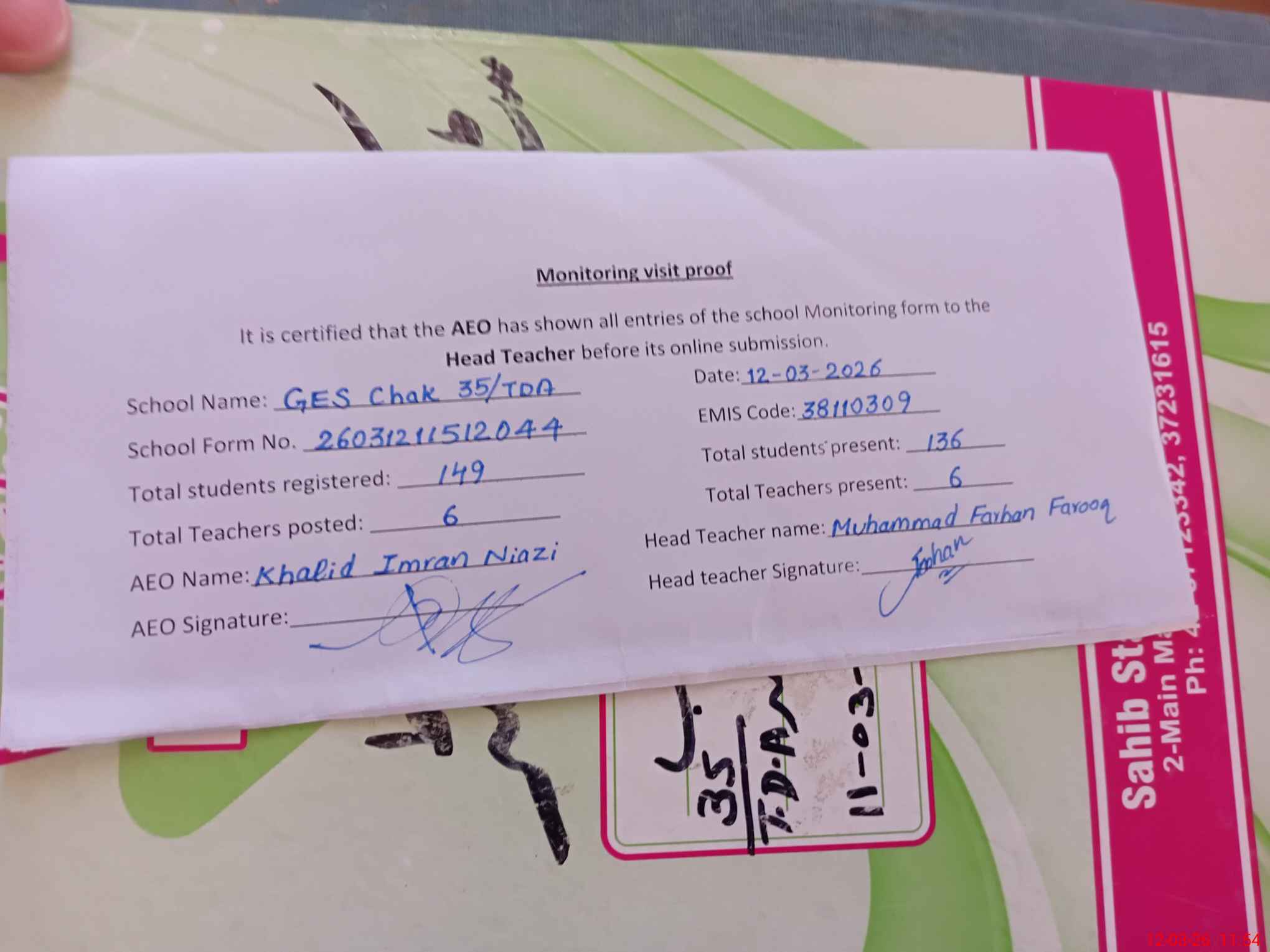 | Attendance Register | Head Teacher | MEA with School | Visit Proof |