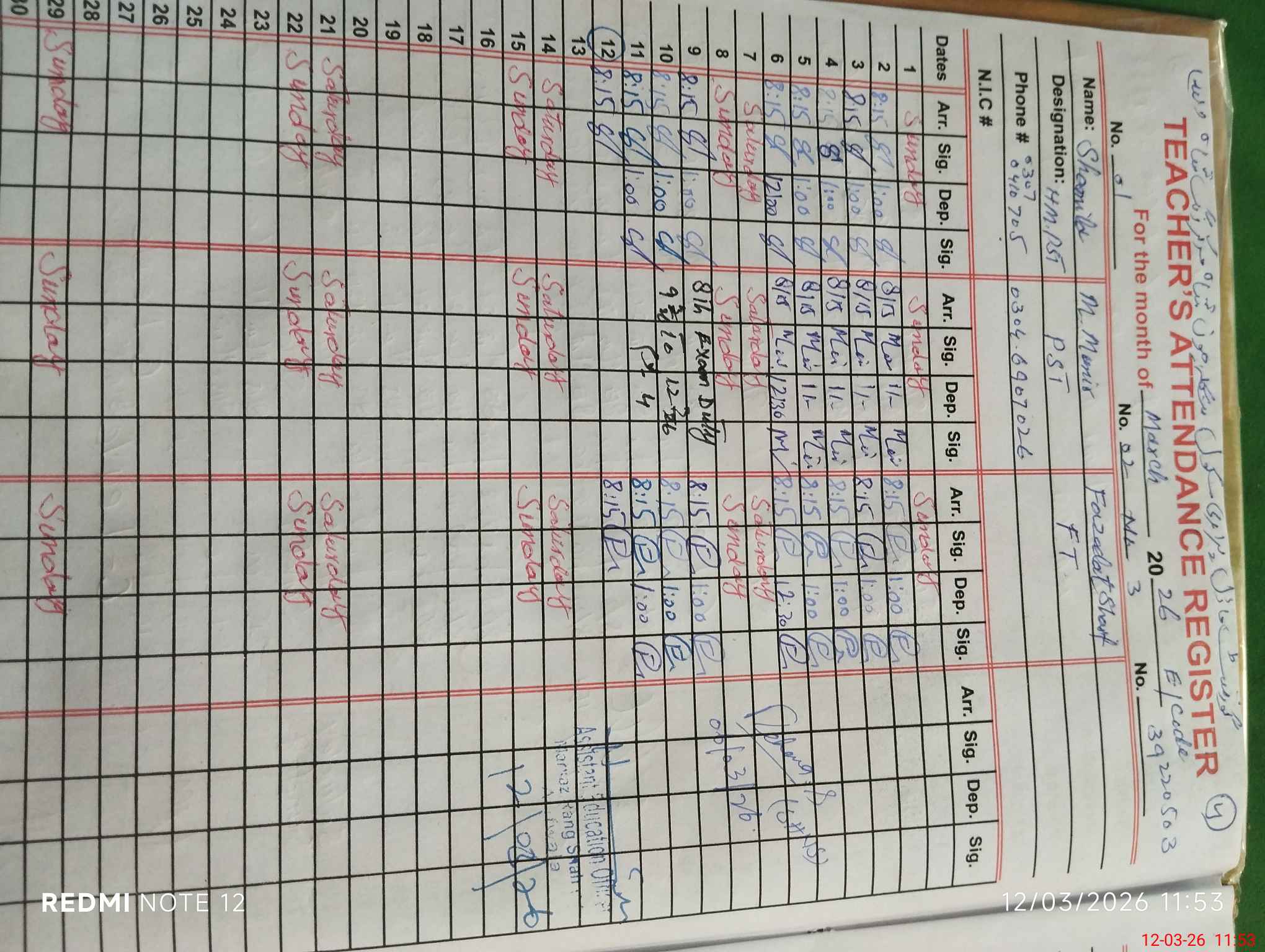| Name: SH**** IR**** Designation: (School Headmaster's/Headmistress's) PST Phone/Cell Number: 03**** |