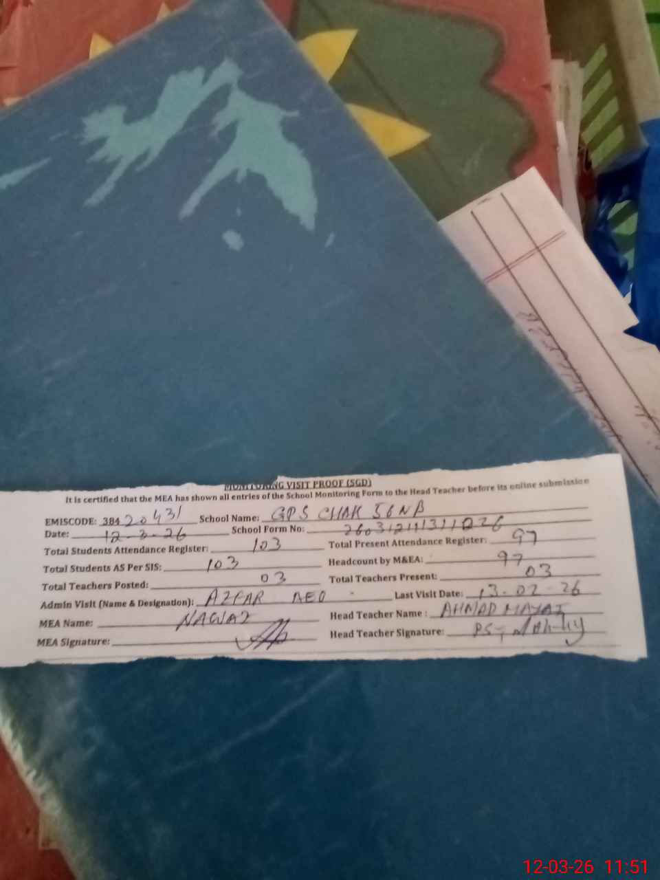 | Attendance Register | Head Teacher | MEA with School | Visit Proof |