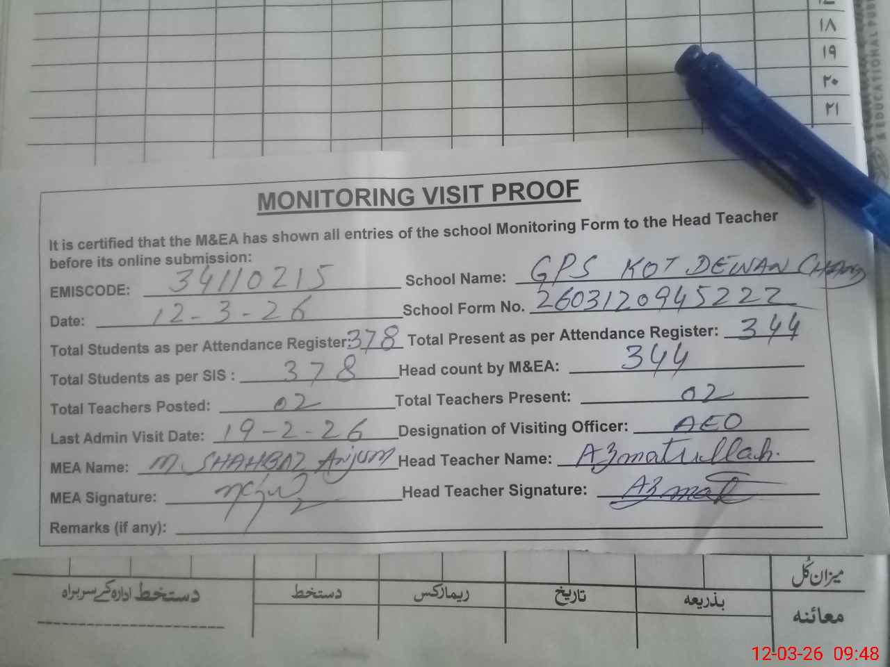 | Attendance Register | Head Teacher | MEA with School | Visit Proof |