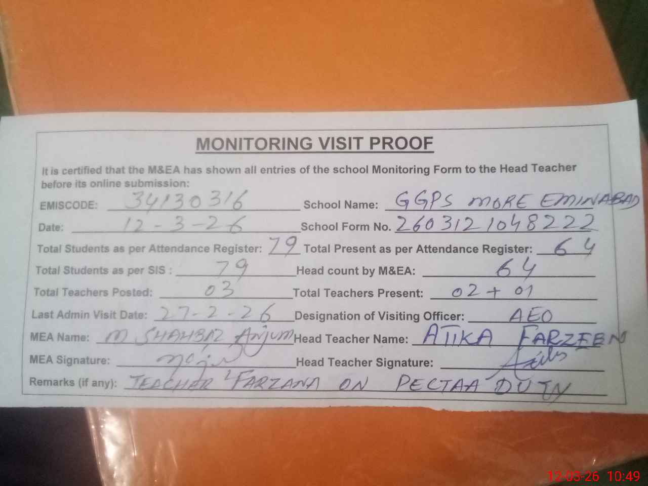 | Attendance Register | Head Teacher | MEA with School | Visit Proof |
