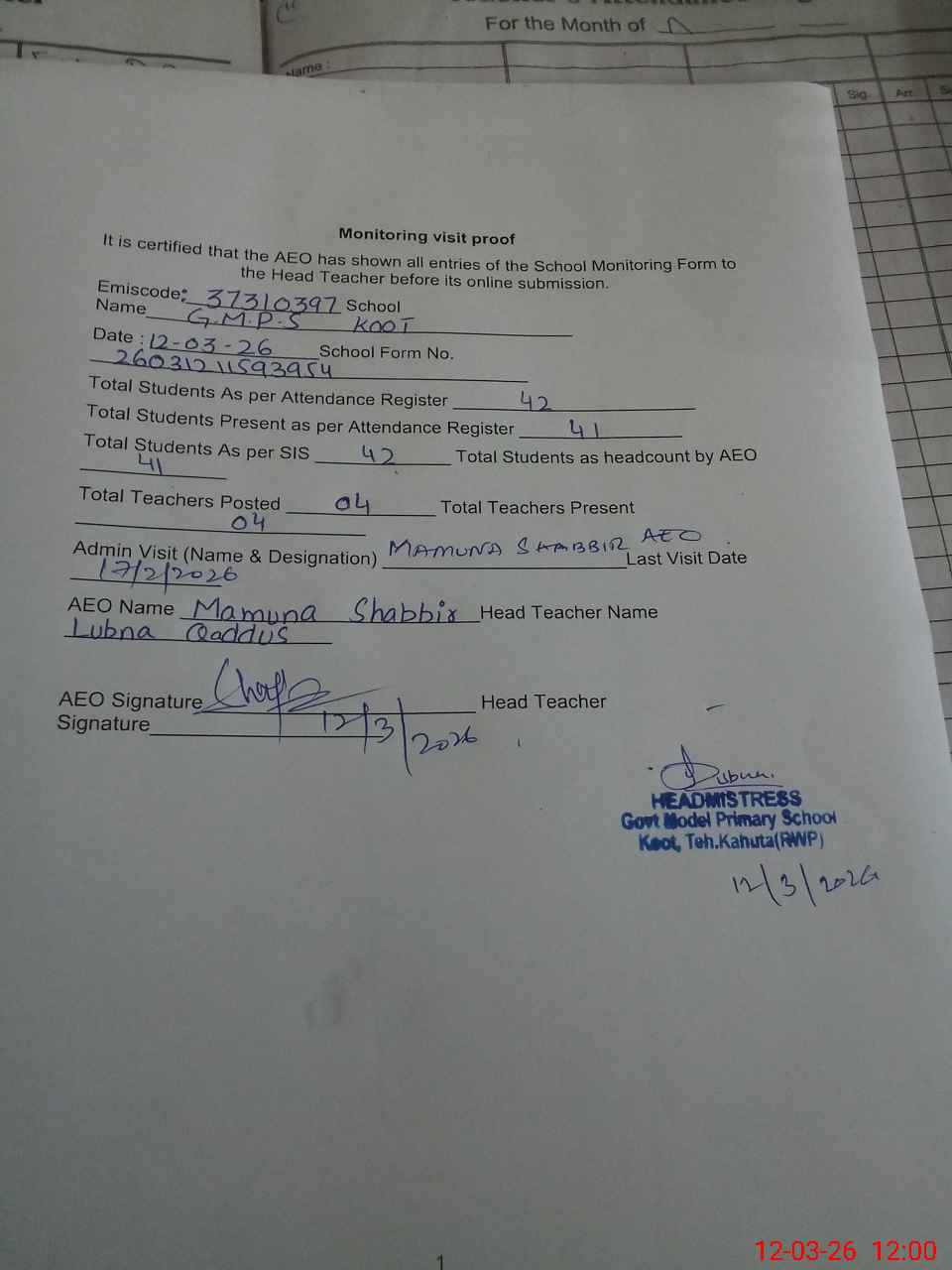 | Attendance Register | Head Teacher | MEA with School | Visit Proof |