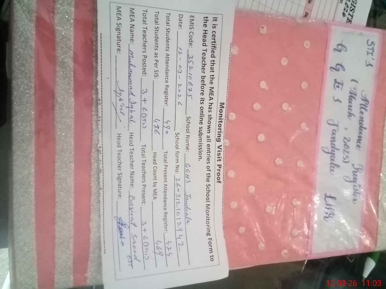 | Attendance Register | Head Teacher | MEA with School | Visit Proof |