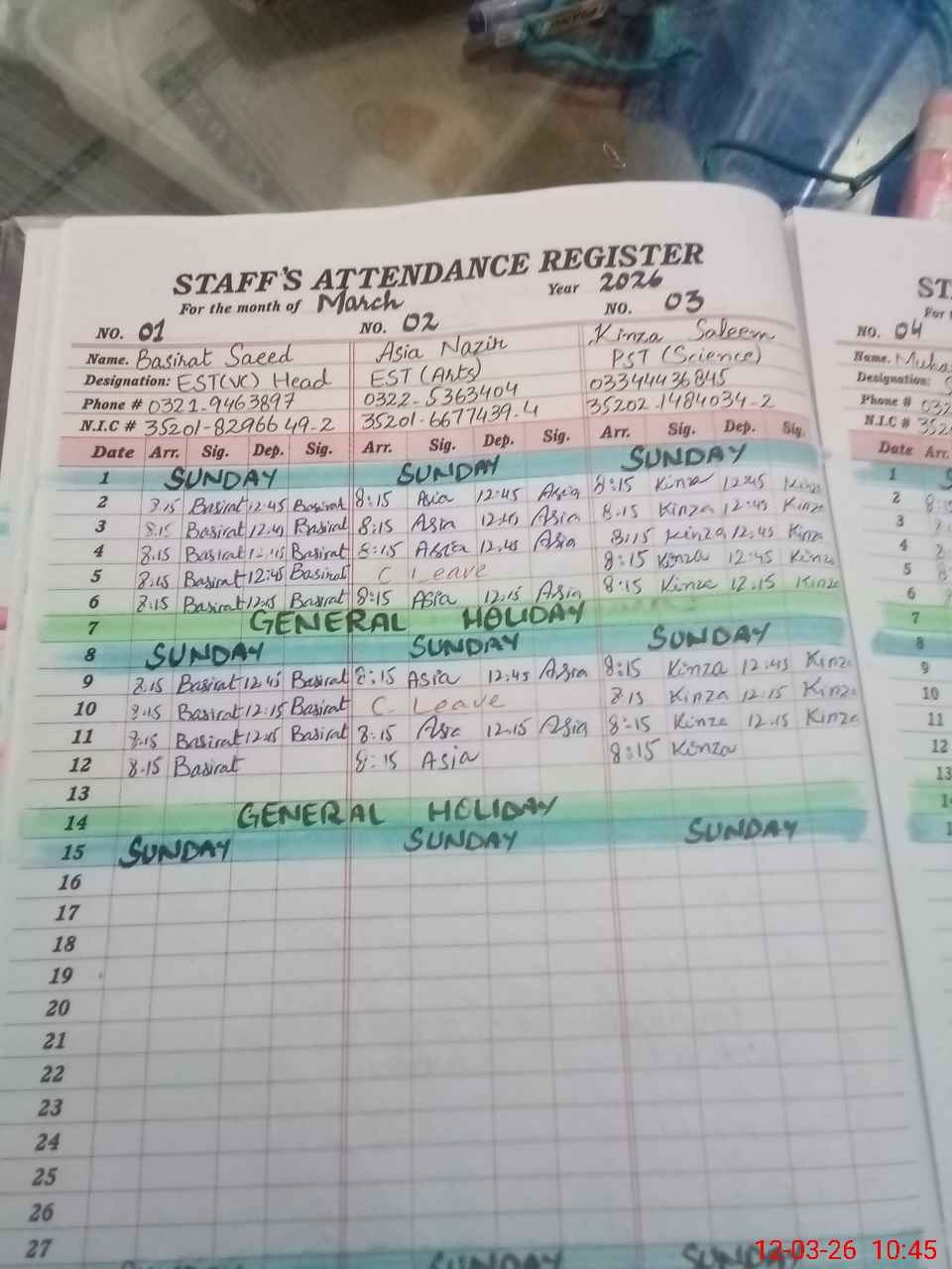 | CNIC | Full Name | Designation | R/C | Absence during last cal. month |