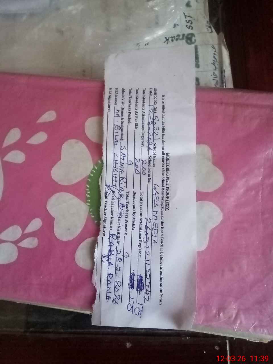 | Attendance Register | Head Teacher | MEA with School | Visit Proof |