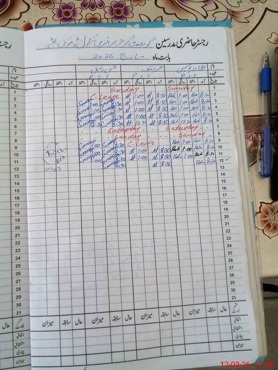 | CNIC | Full Name | Designation | R/C | Absence During Last Calender Month |