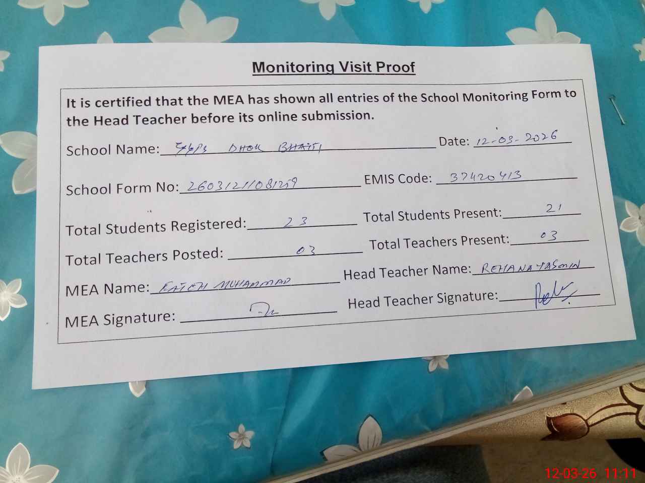 | Attendance Register | Head Teacher | MEA with School | Visit Proof |