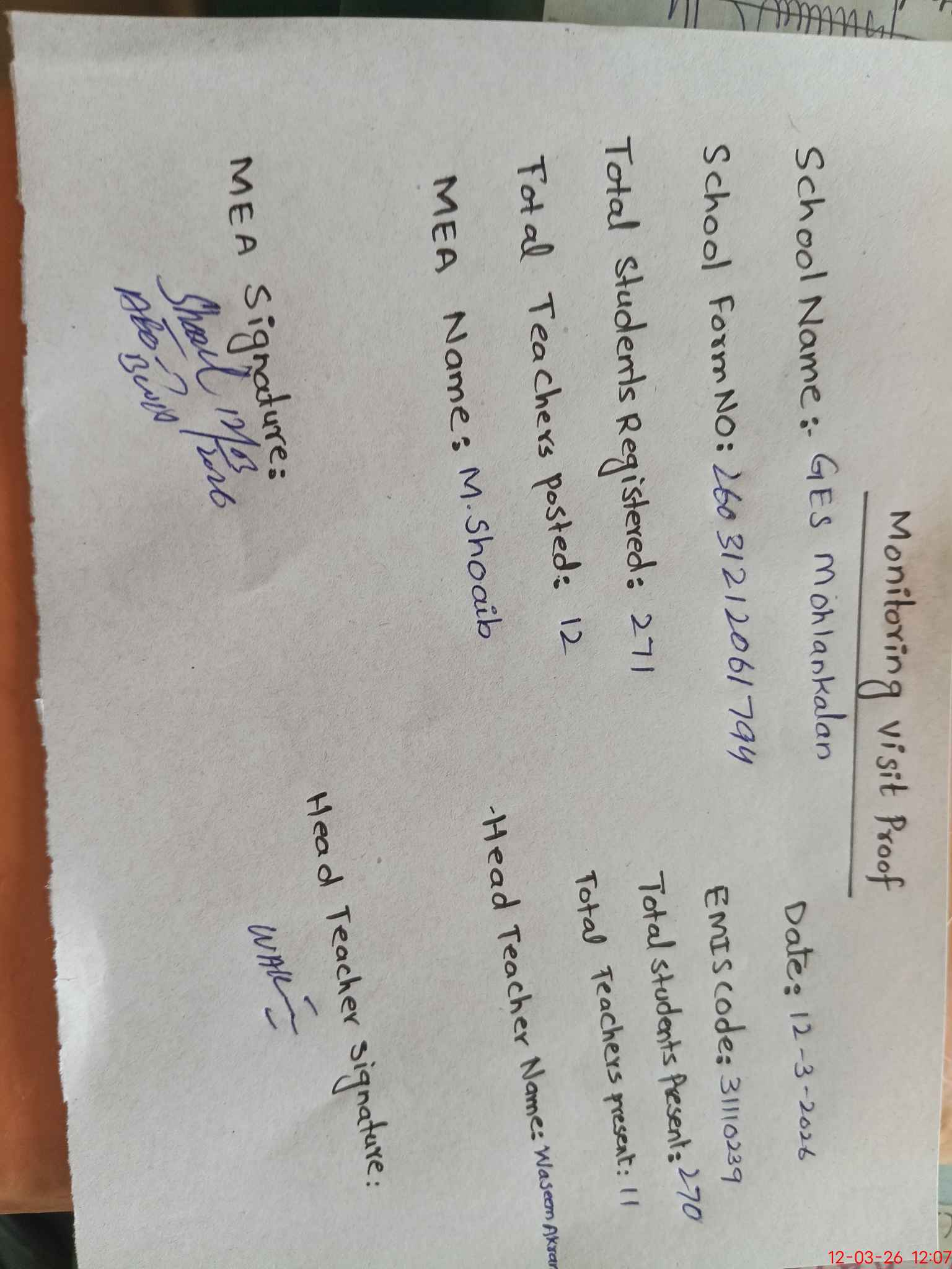 | Attendance Register | Head Teacher | MEA with School | Visit Proof |