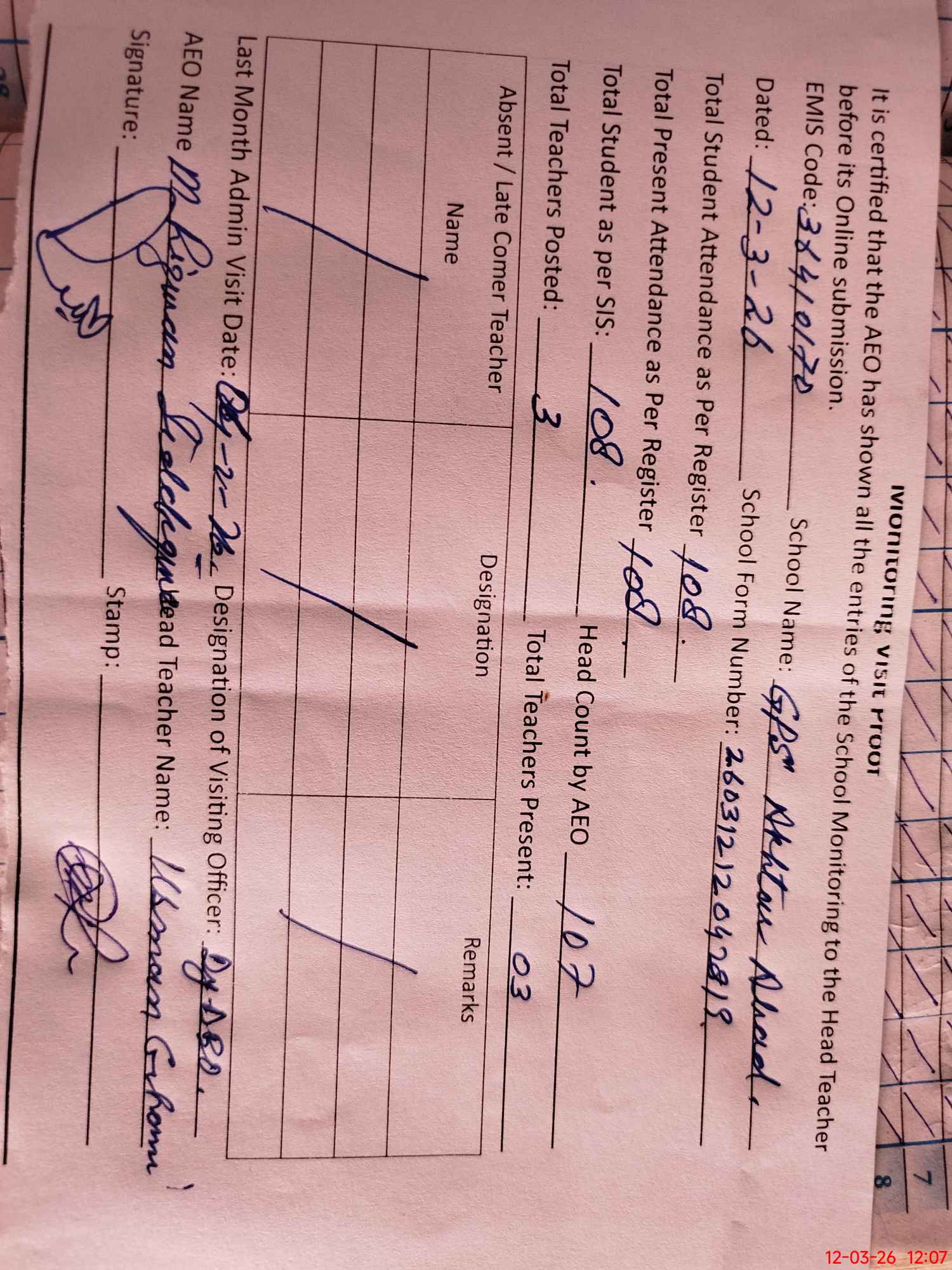 | Attendance Register | Head Teacher | MEA with School | Visit Proof |