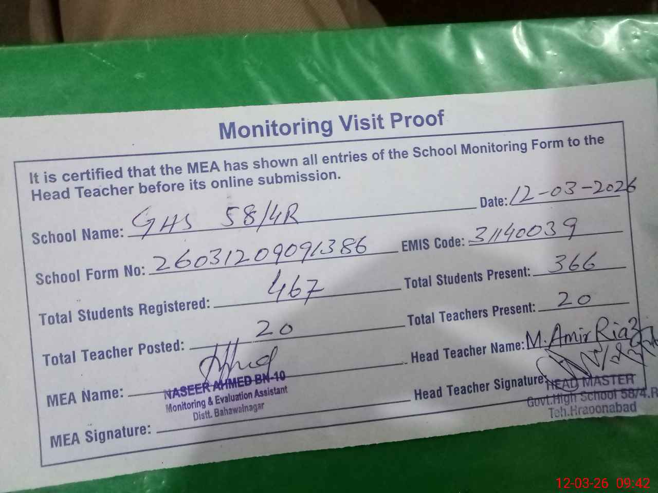 | EMIS Code: 31140039 | Name of School: GHS CHAK 58/4-R | |||