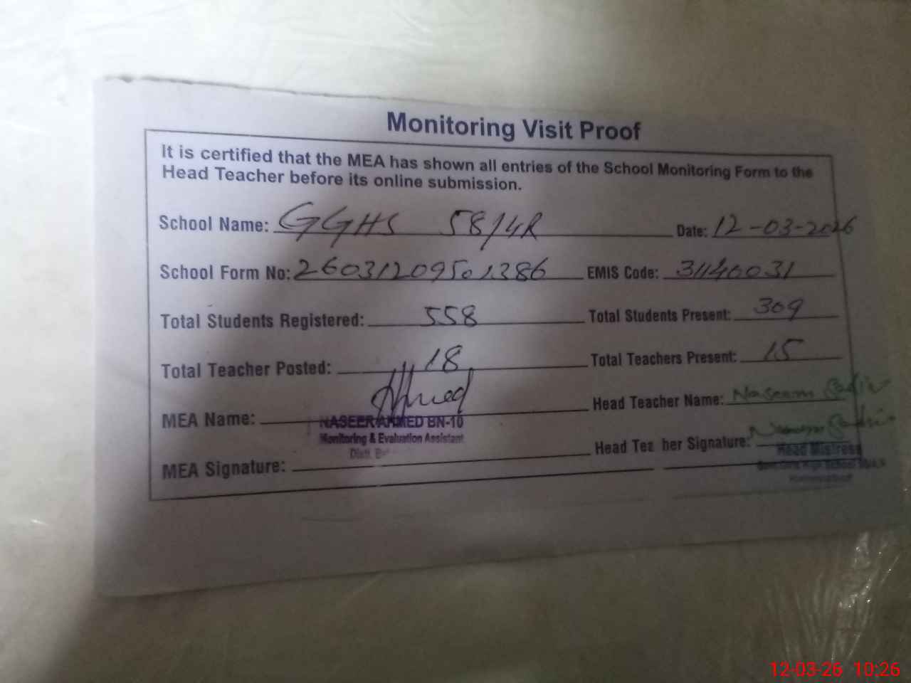 | EMIS Code: 31140031 | Name of School: GGHS CHAK NO.58/4-R | |||