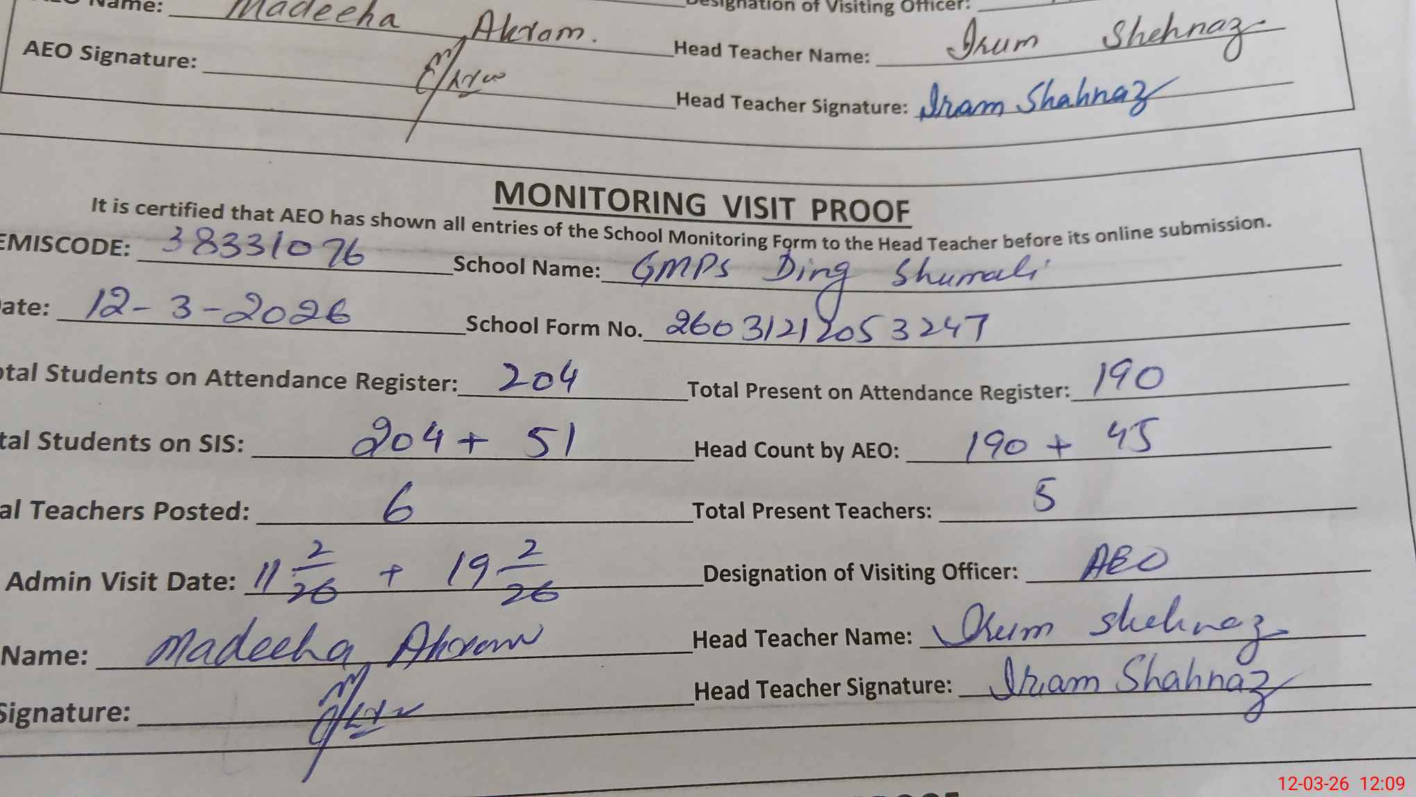 | Monitoring Date: 12-03-2026 | Start Time: 12-03-2026 11:50 AM | End Time: 12-03-2026 12:09 PM | Name of MEA: Ma**** Ak**** | |
