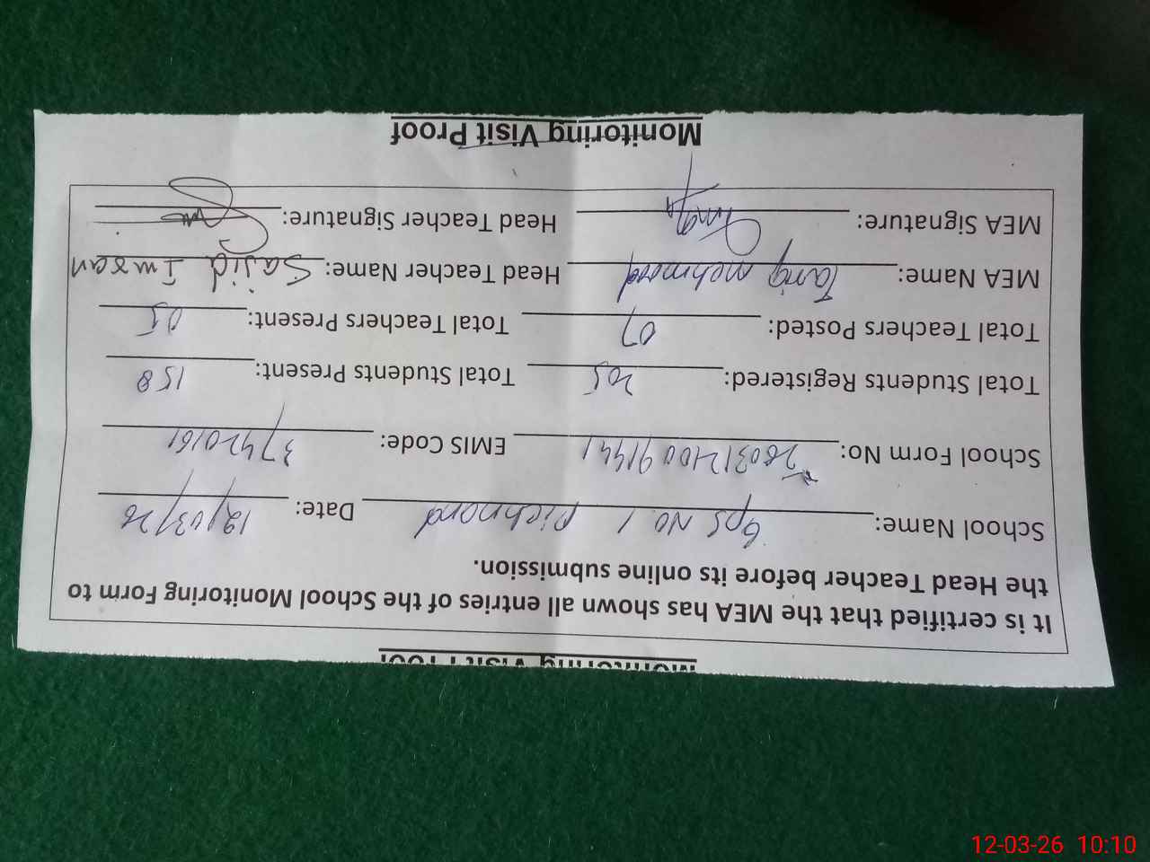 | Certified that this School was Inspected by the Undersigned MEA/DMO Today and the Information Stated Above is as Per Record. | |||||