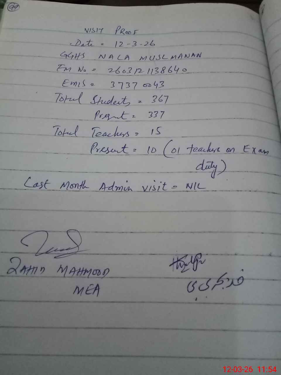 | Attendance Register | Head Teacher | MEA with School | Visit Proof |