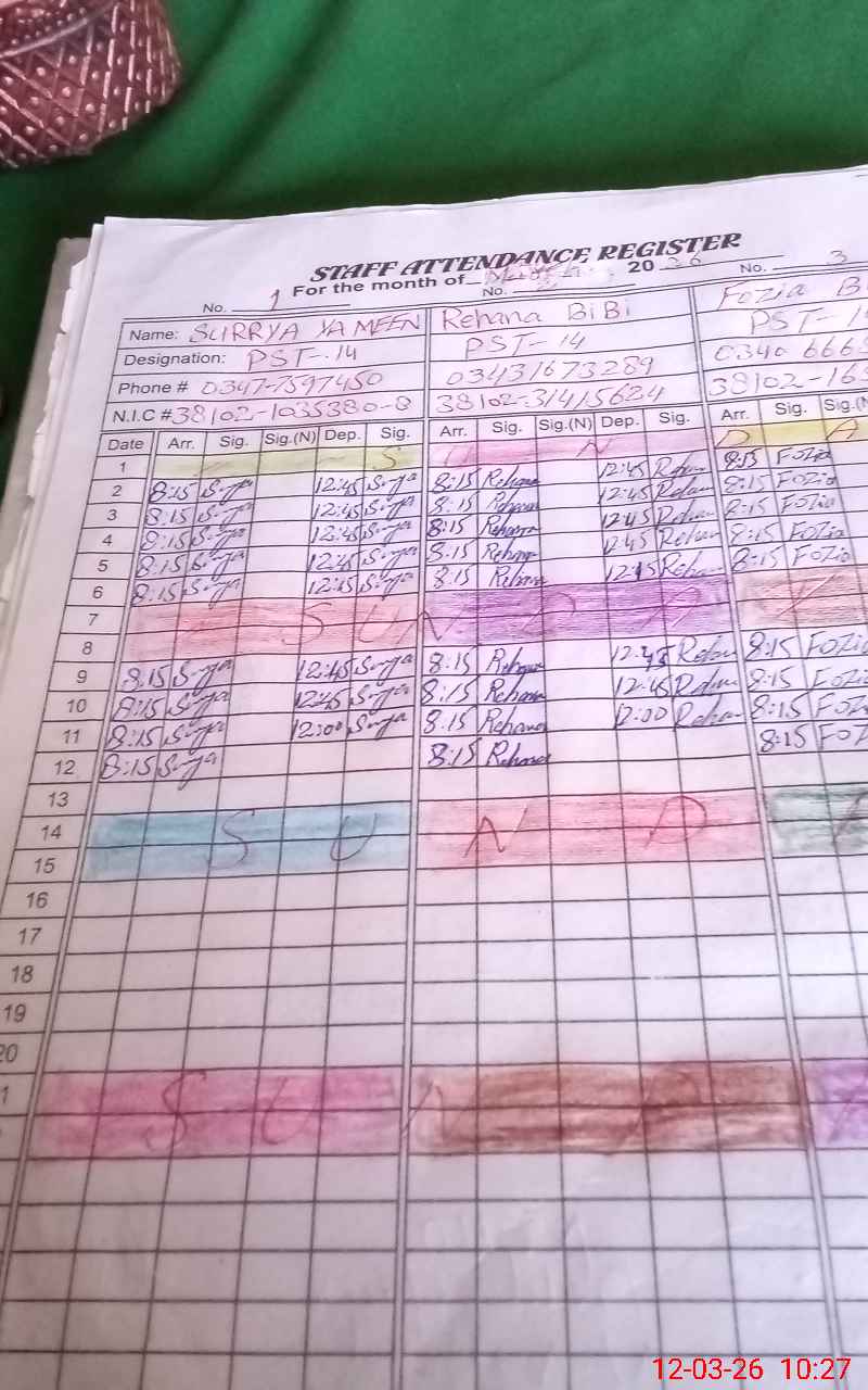 | CNIC | Full Name | Designation | R/C | Absence During Last Calender Month |