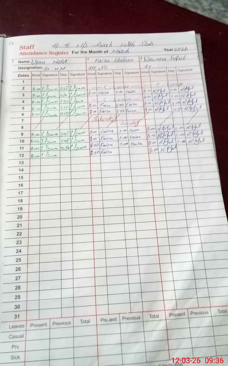 | Remarks (Use Separate Page if Required): class 2,9,10 no paper today marked zero teacher maafia and Shabnam marked official duty attached with examination 8 class. ftf account not matched | |||||
