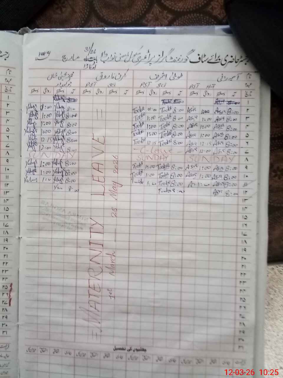 | 35**** | Ki**** Fa**** | PST | Regular | 6 | 0 | 0 | 0 | 0 | 0 | 0 | 0 | 6 | Maternity |
