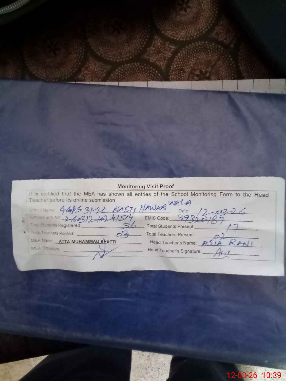 | Attendance Register | Head Teacher | MEA with School | Visit Proof |
