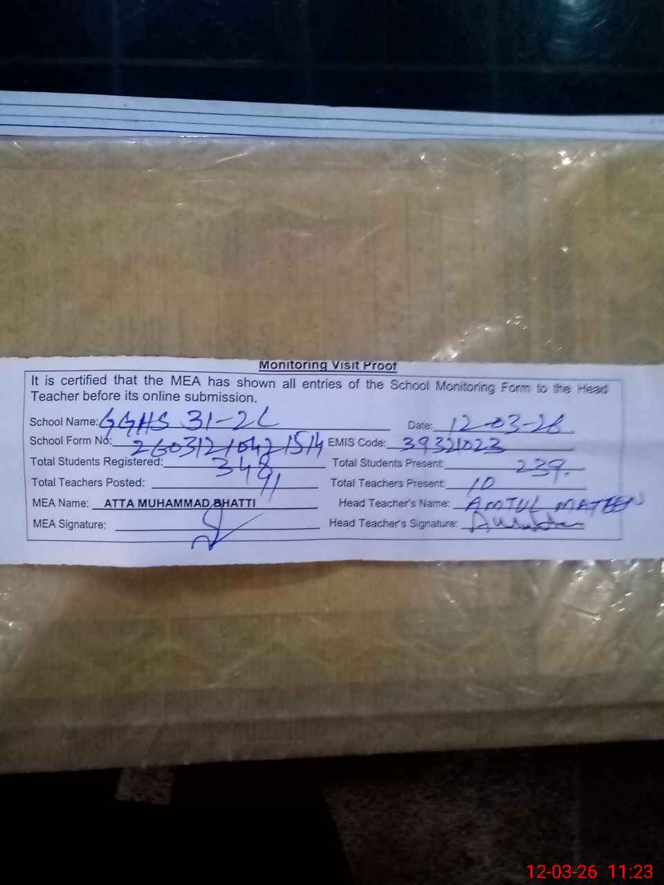 | Remarks (Use Separate Page if Required): 1. Nursery and Two class off having no exam today 2. The school has 09 teaching class rooms and 06 washrooms however 0ne teaching class room and 02 wash rooms of this school are being used by GGPS 31-2L Basti Nawab Wala as said school having not own building | |||||