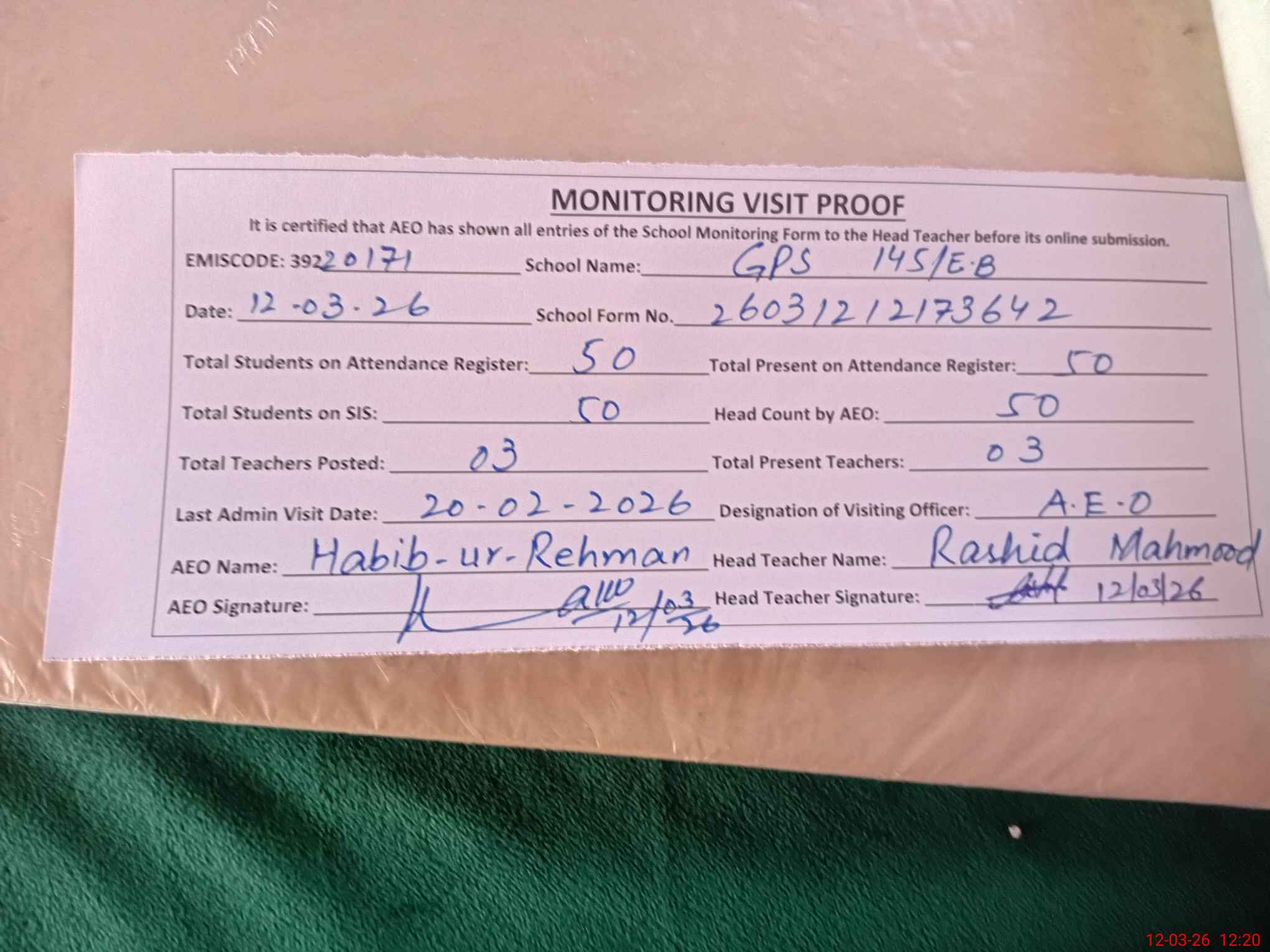 | Attendance Register | Head Teacher | MEA with School | Visit Proof |