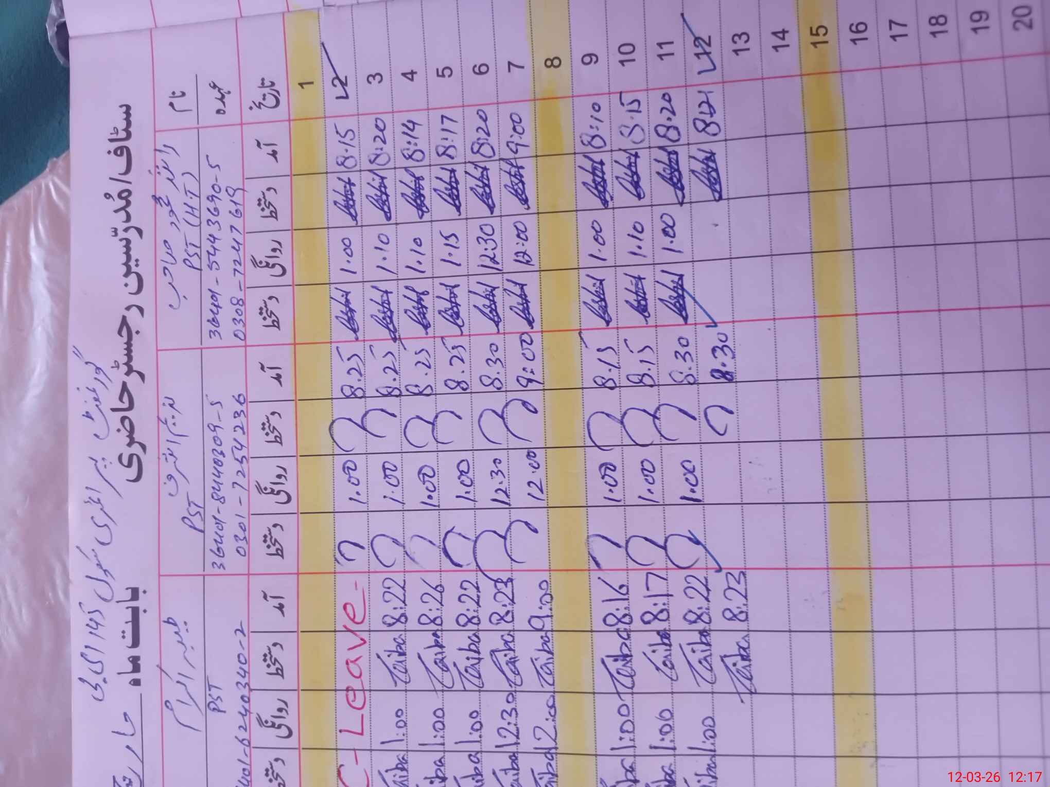 | CNIC | Full Name | Designation | R/C | Absence During Last Calender Month |