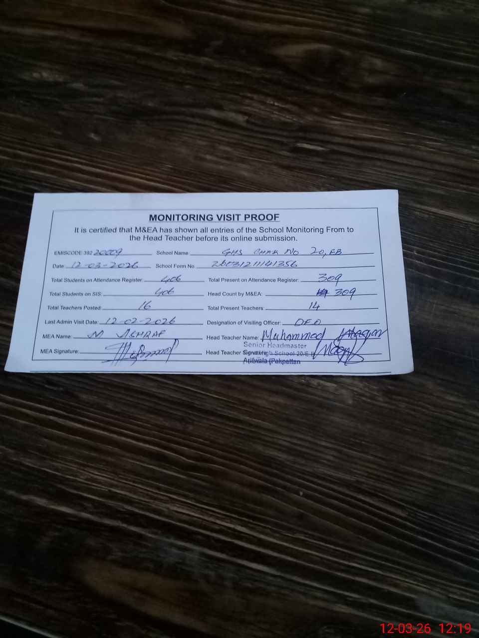 | EMIS Code: 39220009 | Name of School: GHS CHAK NO. 20/EB ARIFWALA | |||