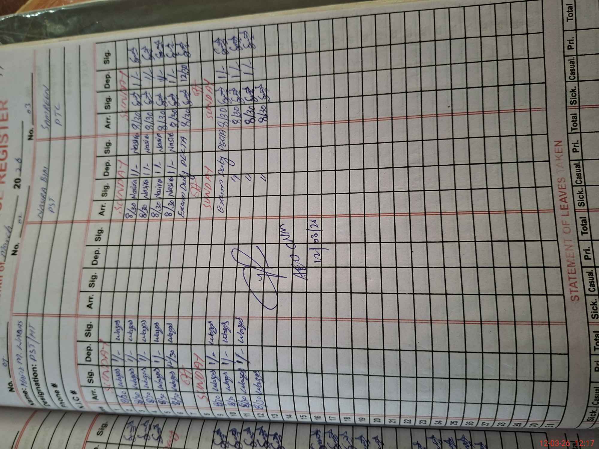 | 36**** | Na**** Bi**** | PST Science/Maths | Regular | 0 | 0 | 0 | 0 | 0 | 0 | 0 | 0 | 0 | Exam Duty |