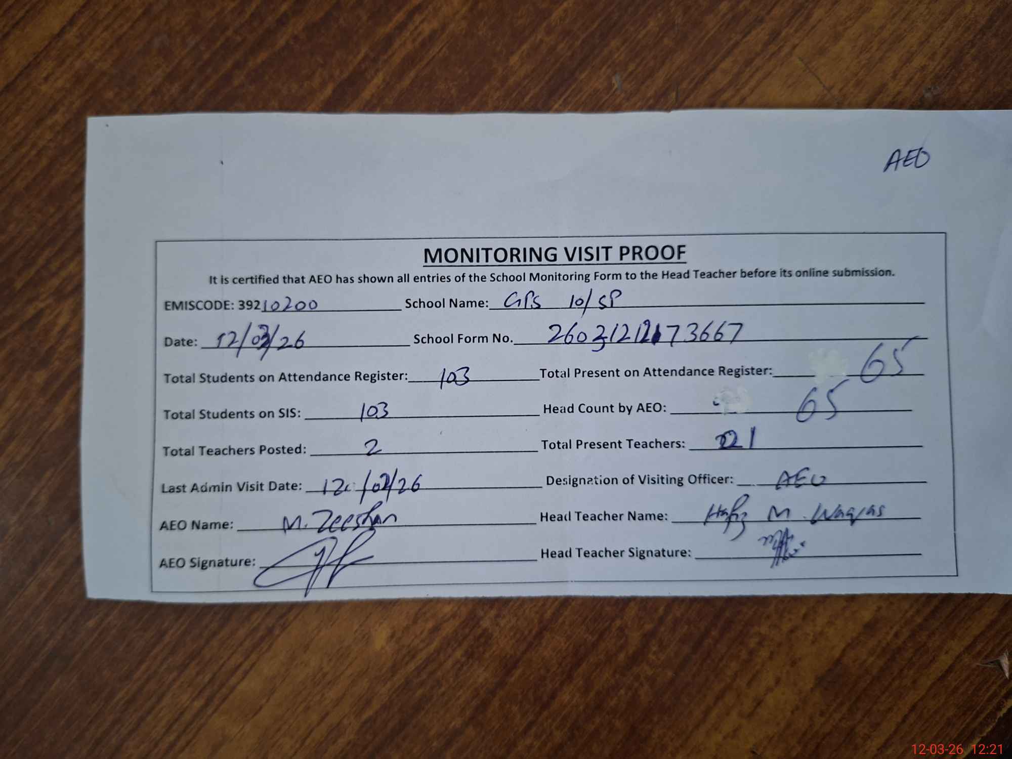 | Attendance Register | Head Teacher | MEA with School | Visit Proof |