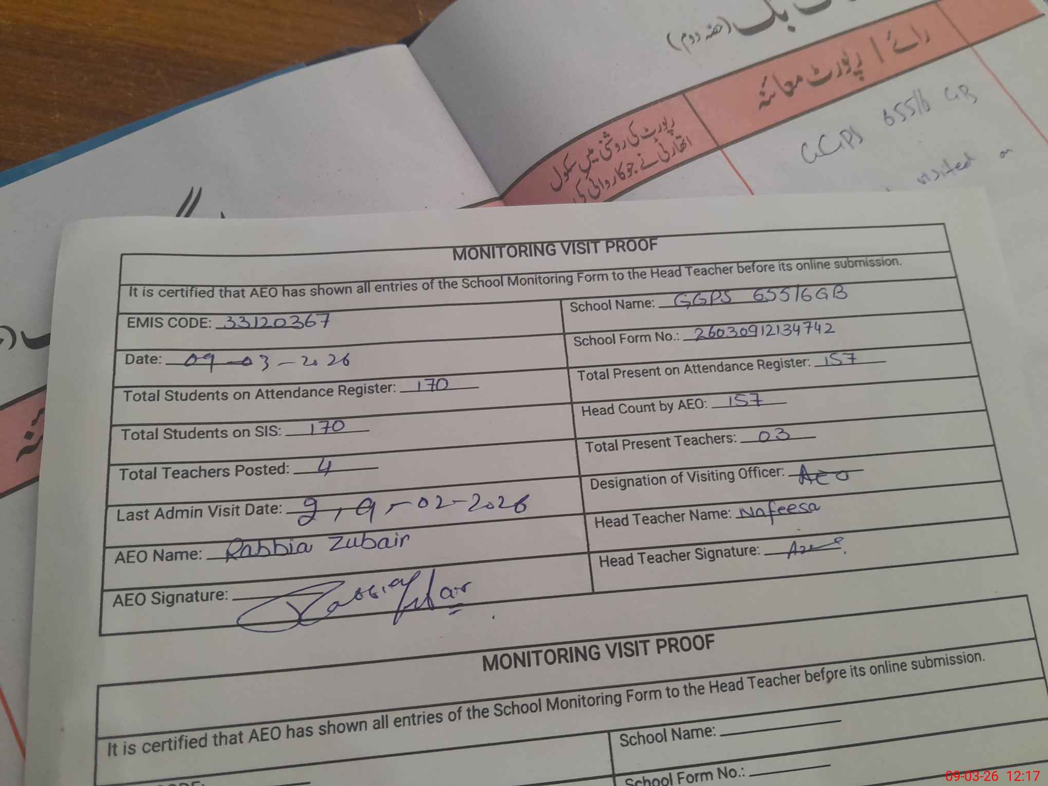 | Attendance Register | Head Teacher | MEA with School | Visit Proof |