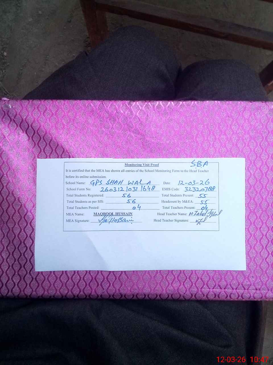 | EMIS Code: 32320788 | Name of School: GPS SHAH WALA | |||
