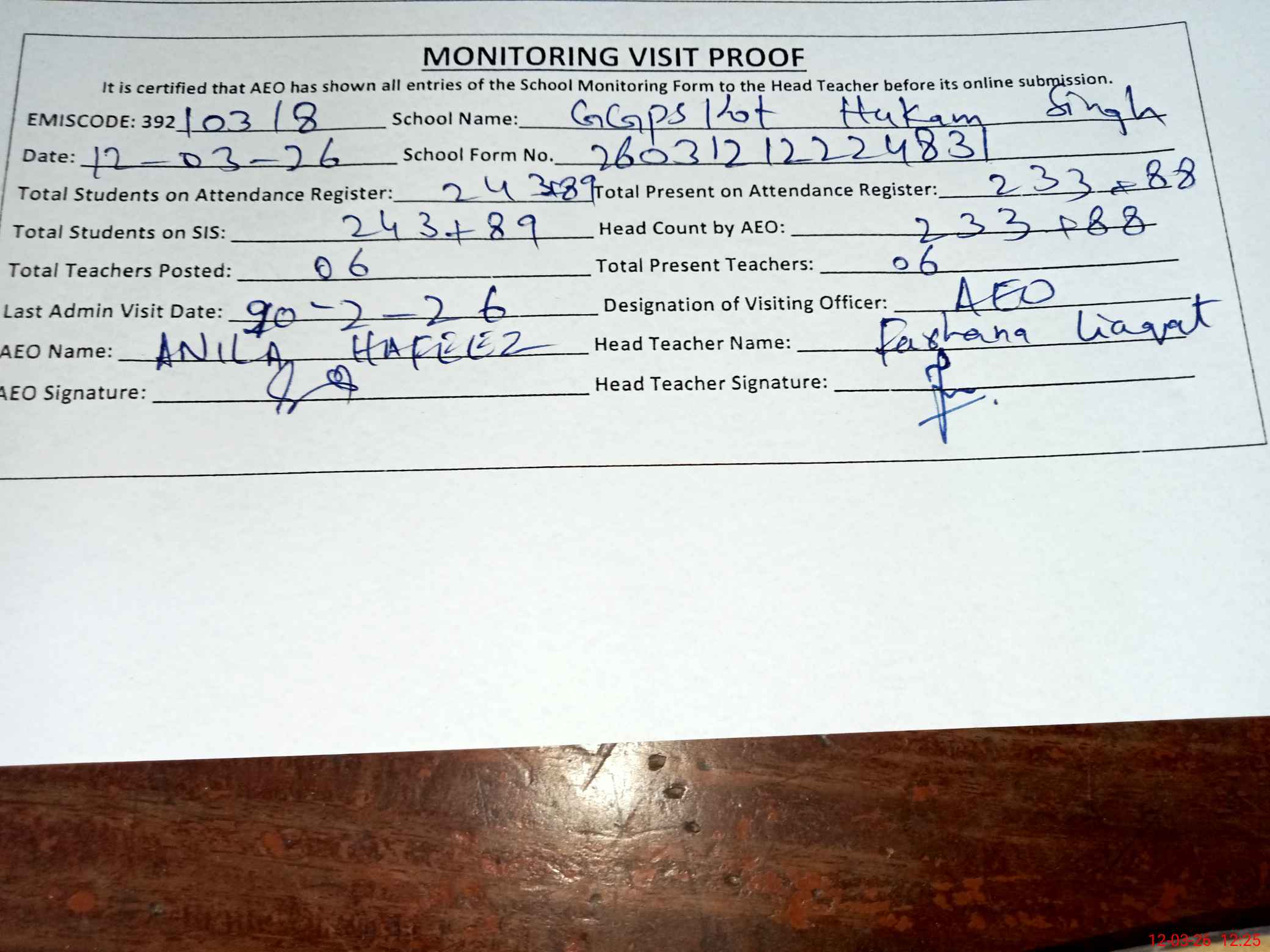 | EMIS Code: 39210318 | Name of School: GGPS KOT HUKAM SINGH | |||