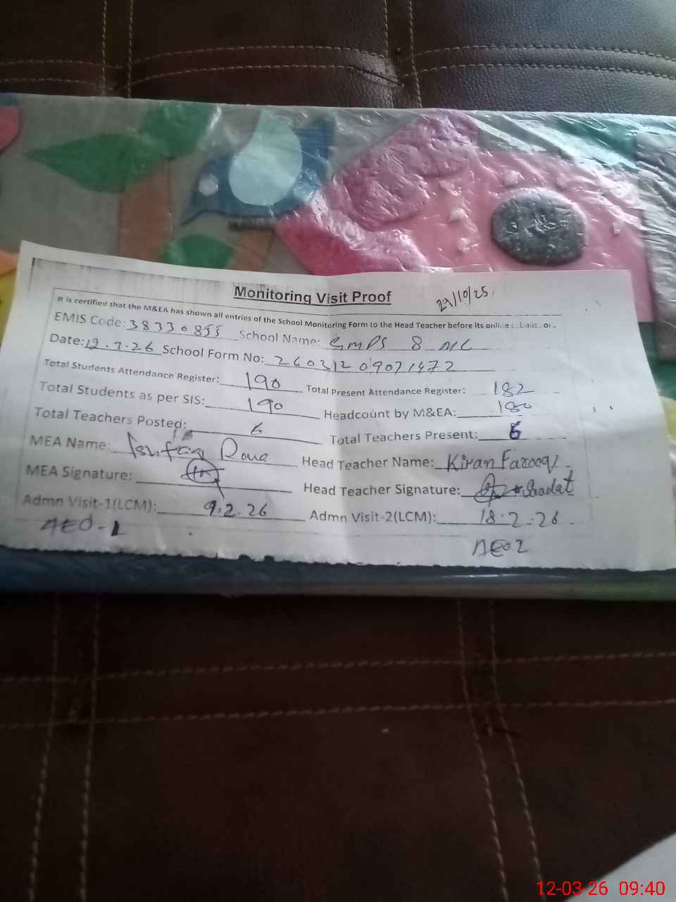 | Attendance Register | Head Teacher | MEA with School | Visit Proof |
