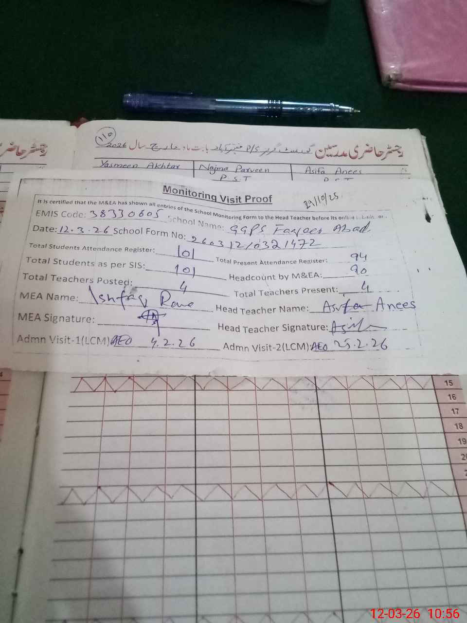 | Attendance Register | Head Teacher | MEA with School | Visit Proof |