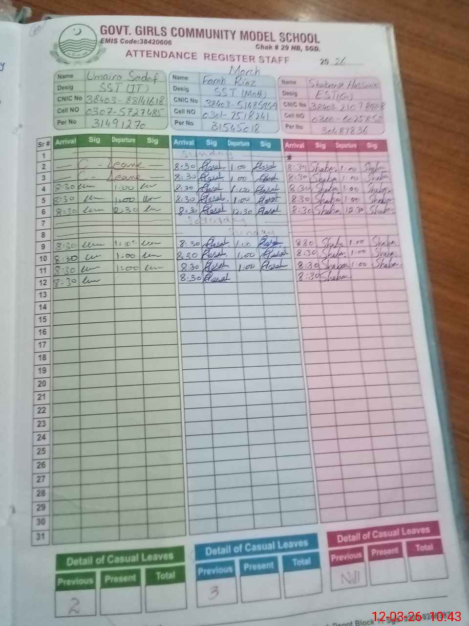 | CNIC | Full Name | Designation | R/C | Absence During Last Calender Month |