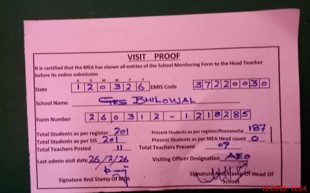 | EMIS Code: 37220030 | Name of School: GES BHILOWAL | |||