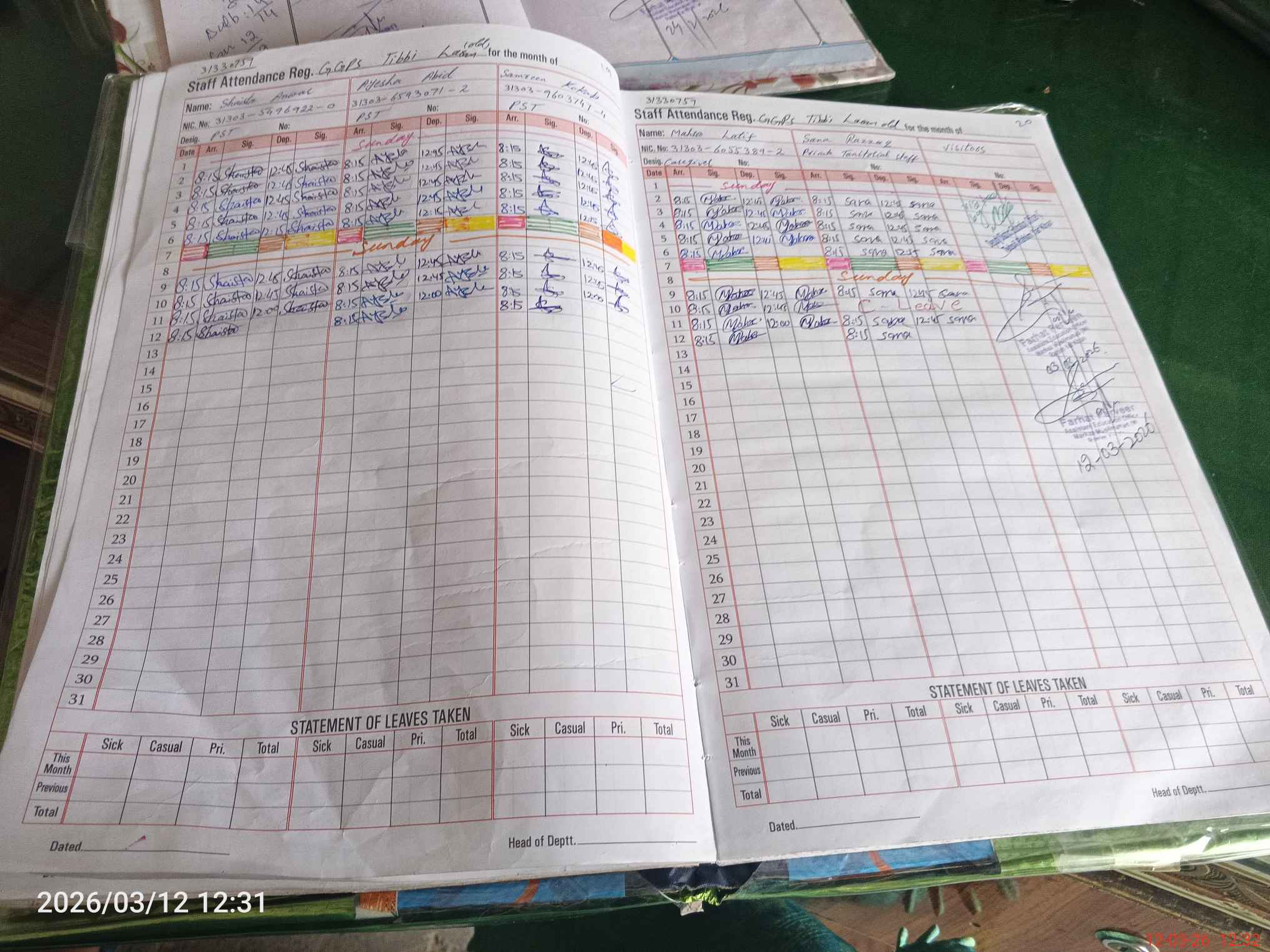 | CNIC | Full Name | Designation | R/C | Absence During Last Calender Month |