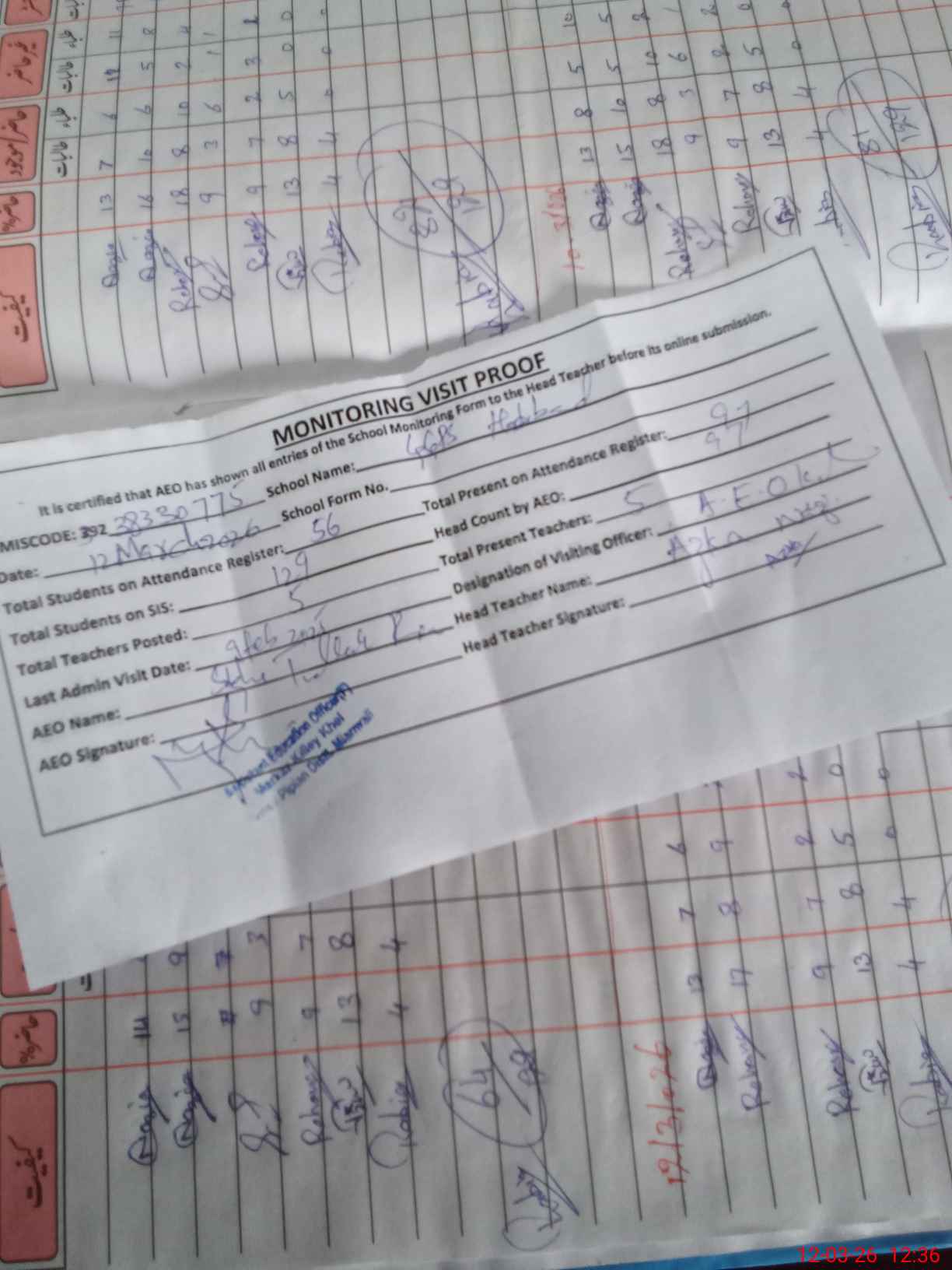 | Attendance Register | Head Teacher | MEA with School | Visit Proof |