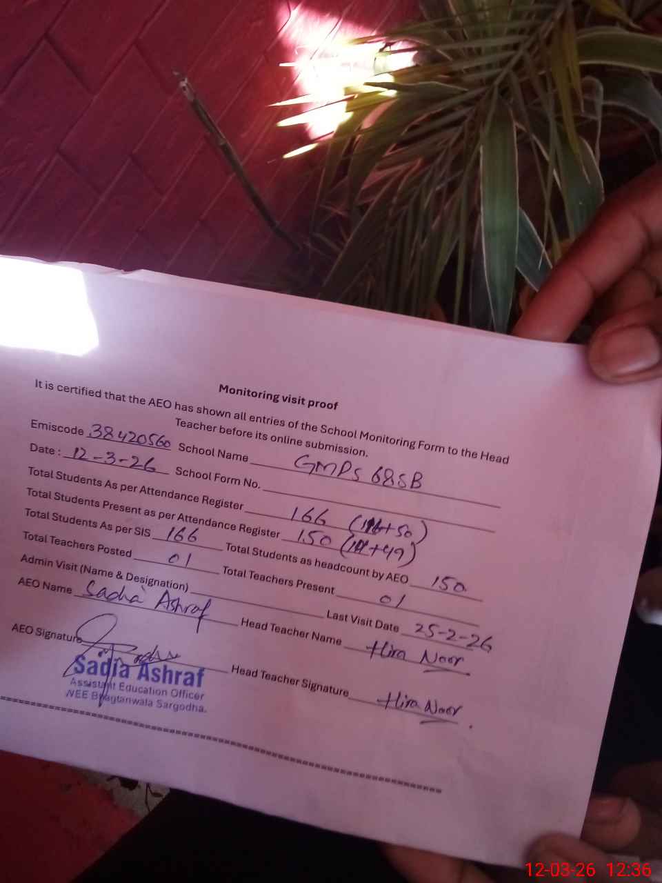| Attendance Register | Head Teacher | MEA with School | Visit Proof |