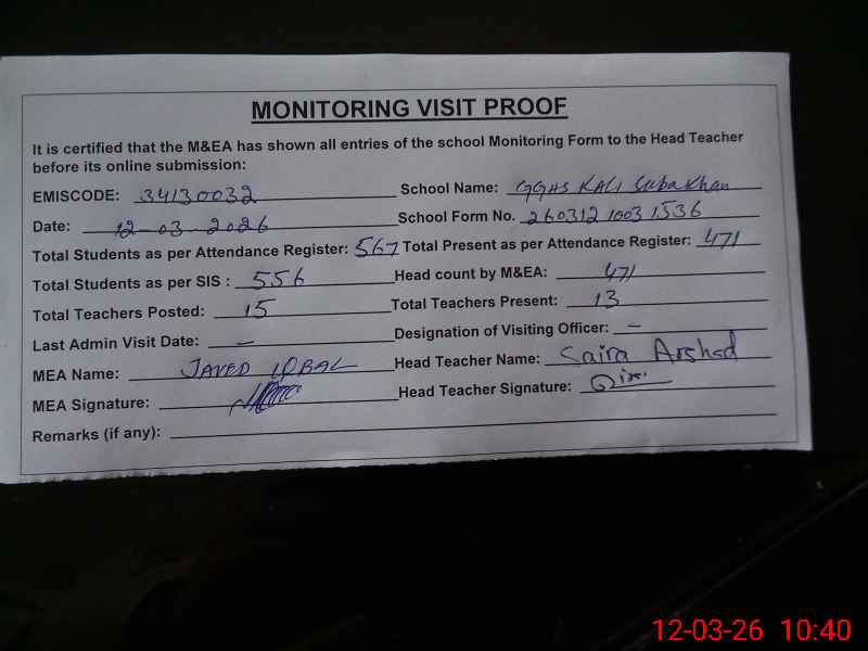 | EMIS Code: 34130032 | Name of School: GGHS KALI SUBA KHAN | |||