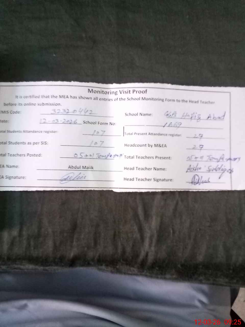 | Attendance Register | Head Teacher | MEA with School | Visit Proof |