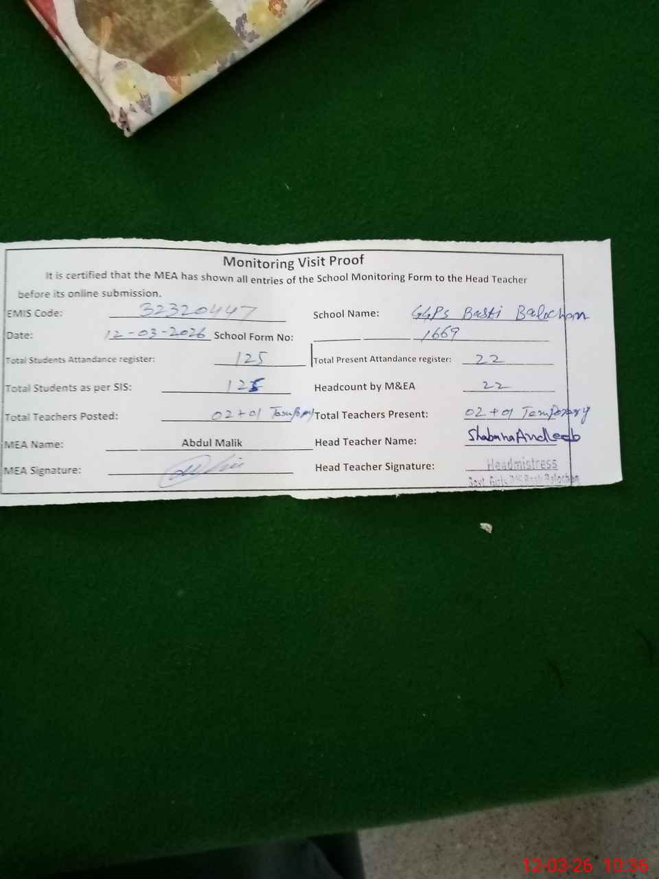 | Attendance Register | Head Teacher | MEA with School | Visit Proof |