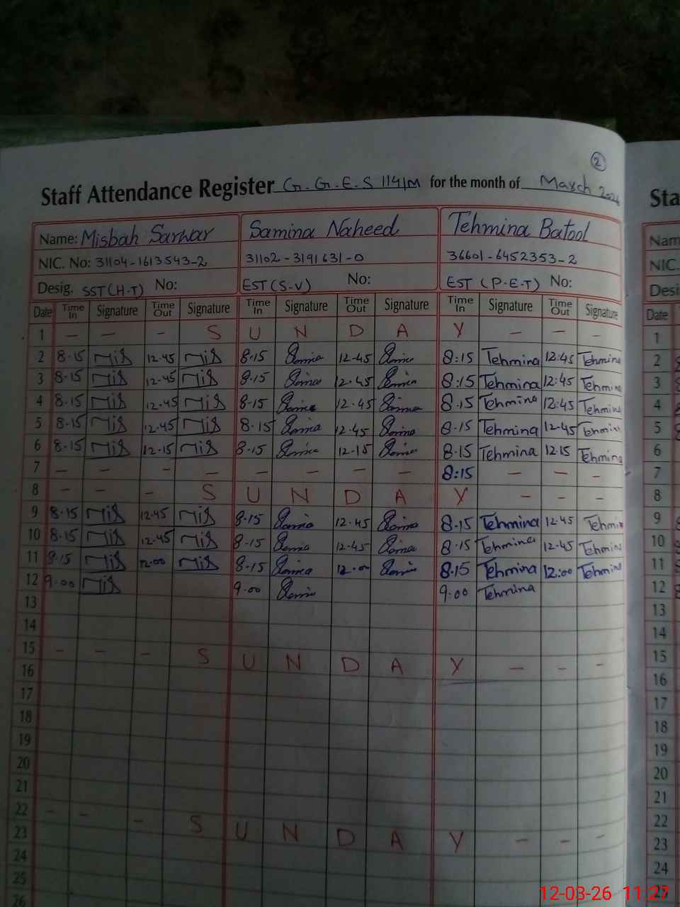 | CNIC | Full Name | Designation | R/C | Absence During Last Calender Month |