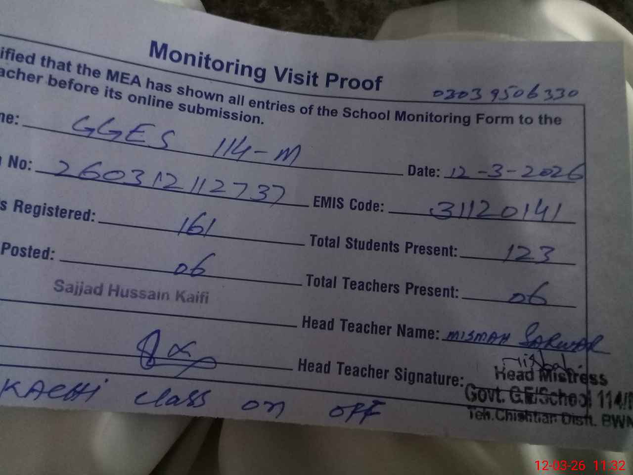 | Name: Mi**** Sa**** Designation: (School Headmaster's/Headmistress's) SST SCI Phone/Cell Number: 03**** |