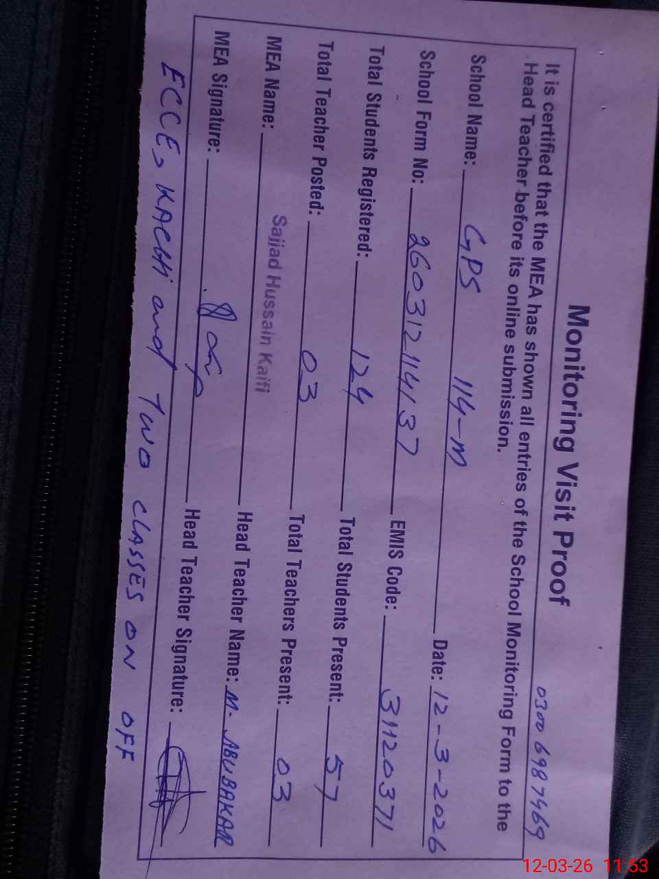 | EMIS Code: 31120371 | Name of School: GPS CHAK NO. 114 M | |||