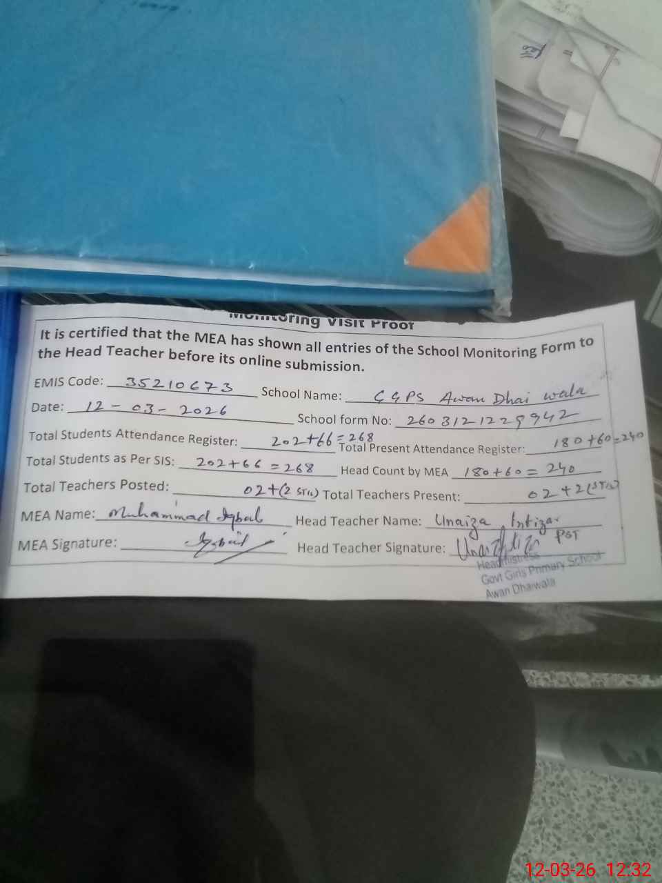 | Attendance Register | Head Teacher | MEA with School | Visit Proof |