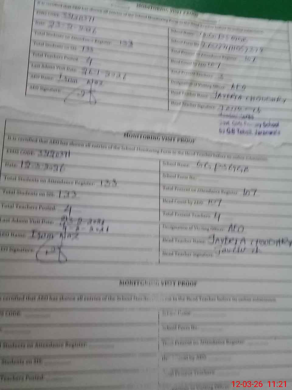| Attendance Register | Head Teacher | MEA with School | Visit Proof |