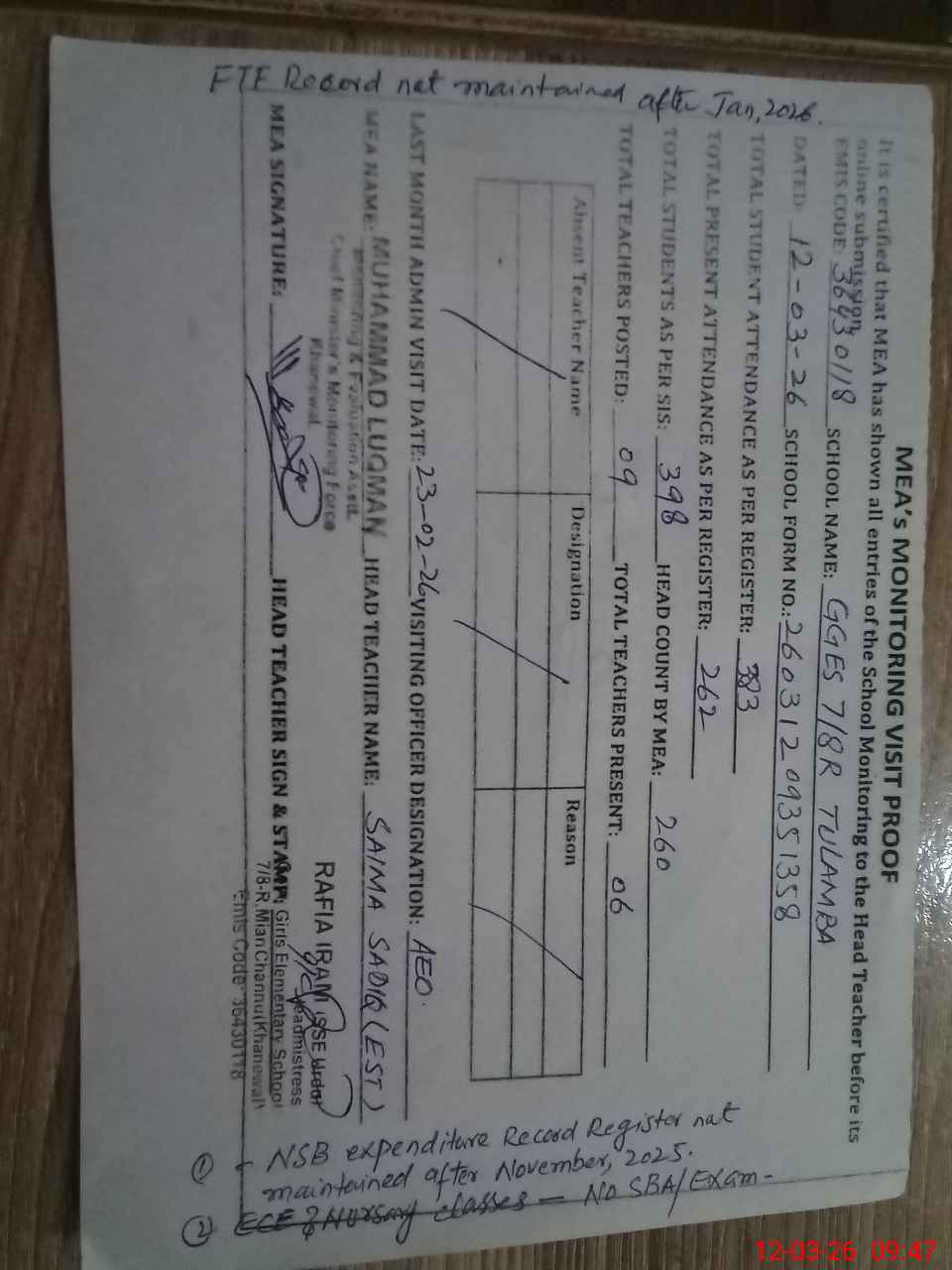 | Remarks (Use Separate Page if Required): ECE and Nursery classes were not physically present as their SBA /exams was not scheduled NSB expenditure record register was not maintained after November 2025 FTF expenditure record register was not maintained after January 2026 | |||||